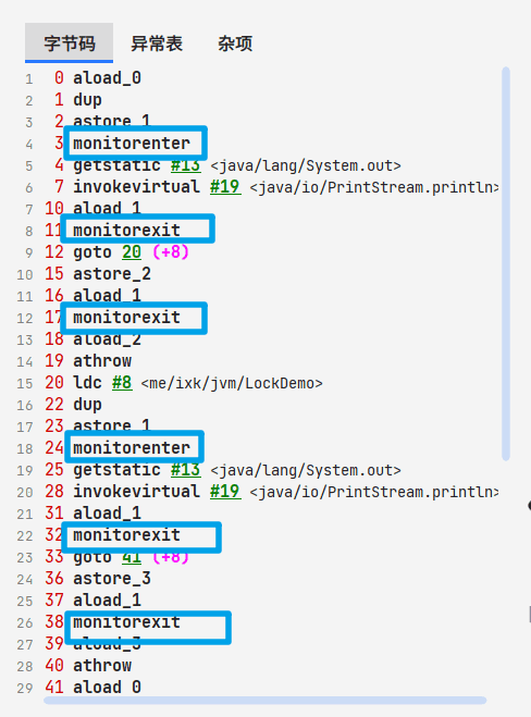 }上面的代码非常简单,就是把各种使用方式都列举了出来,通过 javap -v LockDemo.class 的命令或者使用 jclasslib,我们可以查看字节码文件。这里我就直接使用 jclasslib 了,javap 显示出来的不带高亮,有点难受 23333。